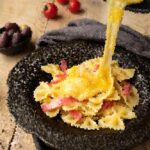 4. Quickly pour the egg and cheese mixture into the pasta, tossing vigorously to create a creamy sauce. Add reserved pasta water a little at a time to reach the desired consistency.